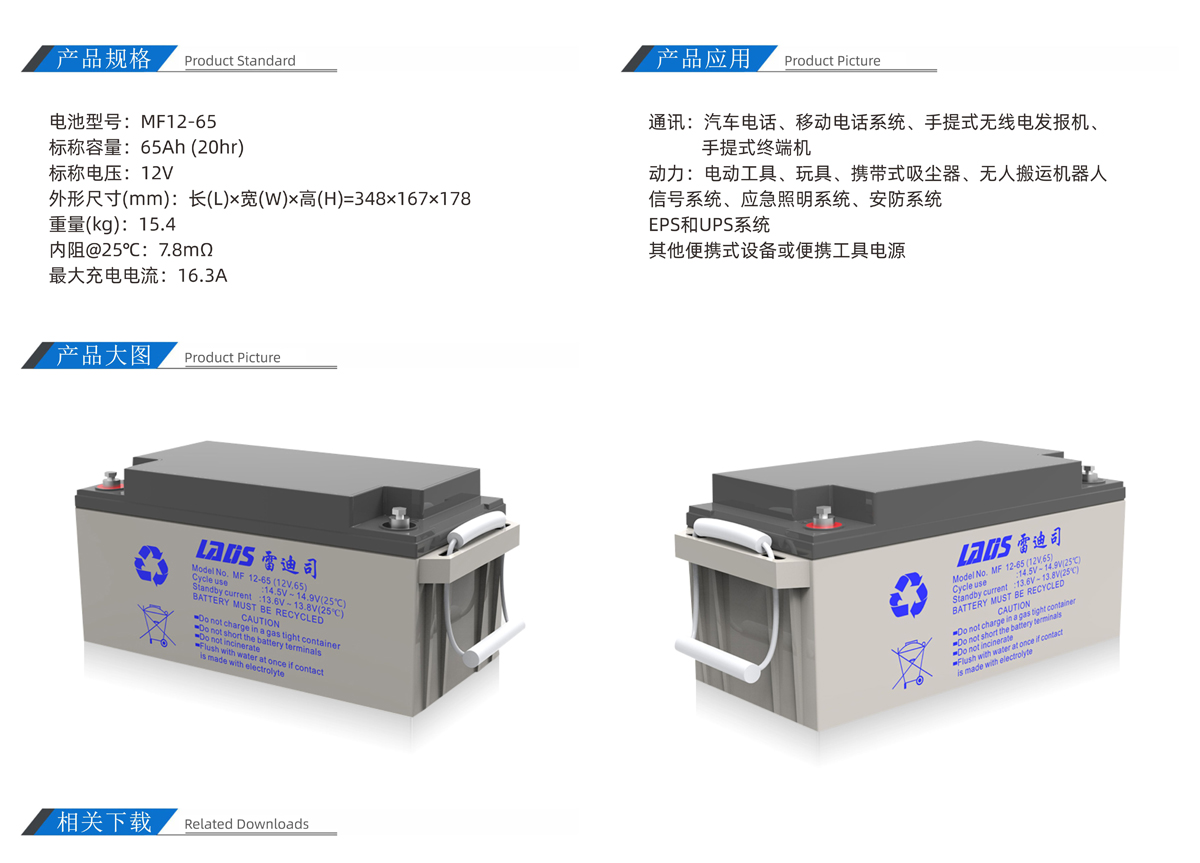 雷迪司MF12-65 12V 65AH閥控密封式鉛酸免維護蓄電池